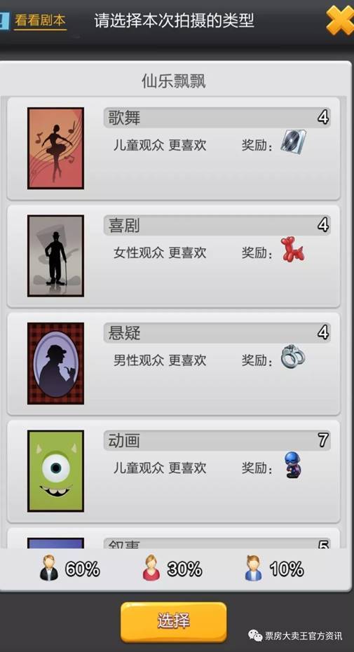 1、我们未选择剧本之前,只能看到30%的观众比例,这个比例目前无法通过任何方式提升,只有在我们选择完想要拍摄的剧本后,才能看到完整100%的观众比例,这30%的观众比例是给我们选择拍摄剧本的一个参考作用,在票房大卖王这个随机性质比较强的游戏里,不定期会有比较奇特的事情发生,例如:我们在未选择剧本前看到的观众比例为 男10% 儿童20%,在我们选择剧本后,变成:男80%,女0%,儿童20%这样极端的观众比例也是有几率出现的。