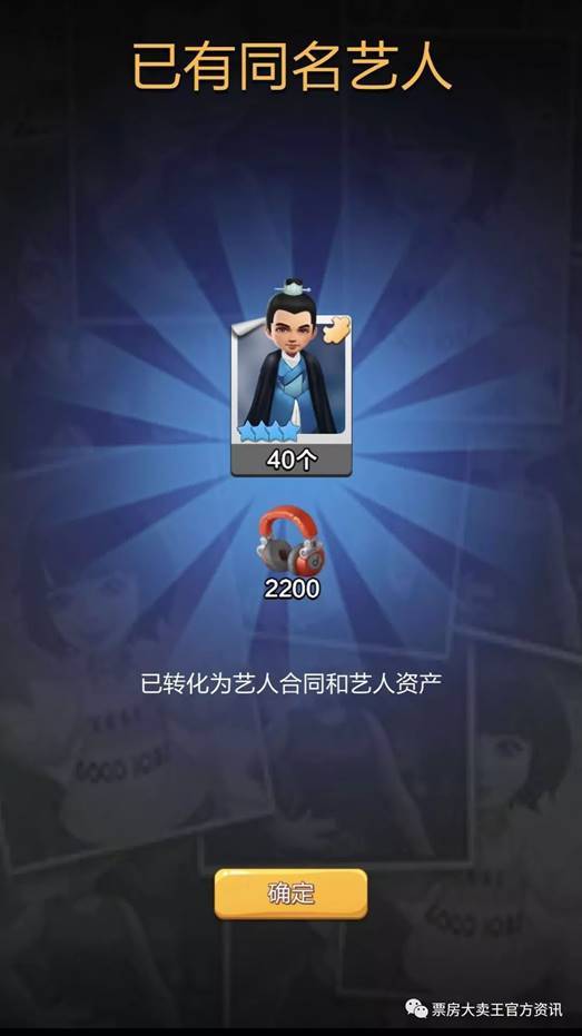 获得一星资产:7000个(新加入票房大卖王的导演可以通过参加10日后的每日充值活动,获取五星艺人碎片,如招募到重复五星艺人,可获取资产和对应艺人合同)